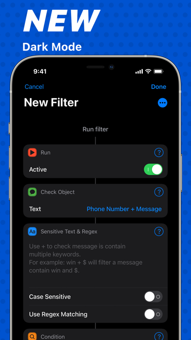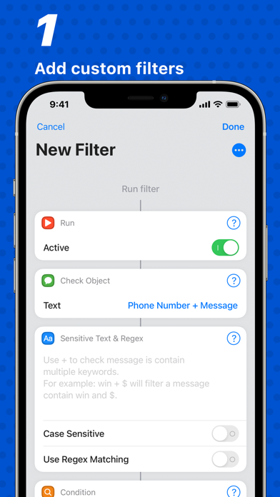 Filter your messages like a pro, support check phone numbers, text, containing multiple keywords, start/end with keywords, match with Regular Expression and other advanced features.