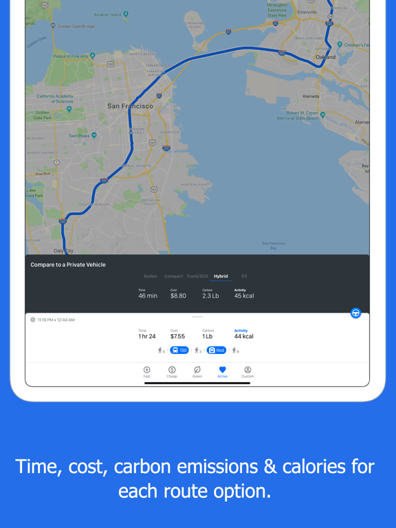 6) See how your trip compares to an equivalent private vehicle trip on time, cost, emissions & calories.