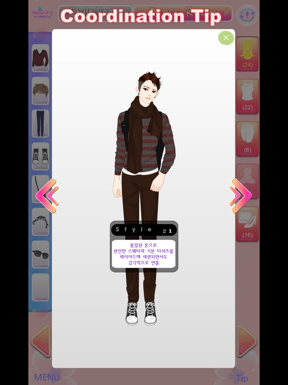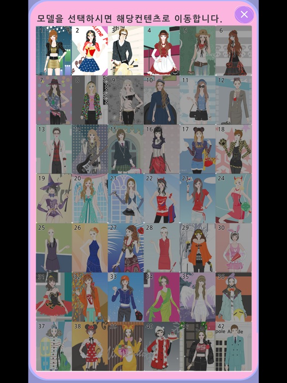 - 처음 실행을 해서 인트로 화면에서 43개의 모델중 한명을 선택합니다. 프리버전은 43개의 모델을 모두 보실 수 있지만 코디는 앞의 4명의 모델만 코디하실 수 있습니다.
