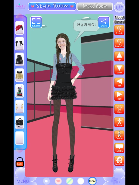 - 드레스룸(DressRoom)에서 분류(헤어,상의,하의,원피스,신발,악세사리)에 따라 이동하면서 코디하고자 하는 옷을 선택하면 ItemBox로 옷이 저장됩니다.(ItemBox를 한번 더 클릭하면 선택한 옷을 삭제할 수 있습니다). 총 20개의 옷을 아이템 박스에 넣을 수 있습니다.