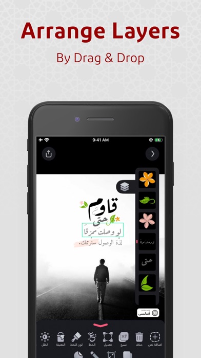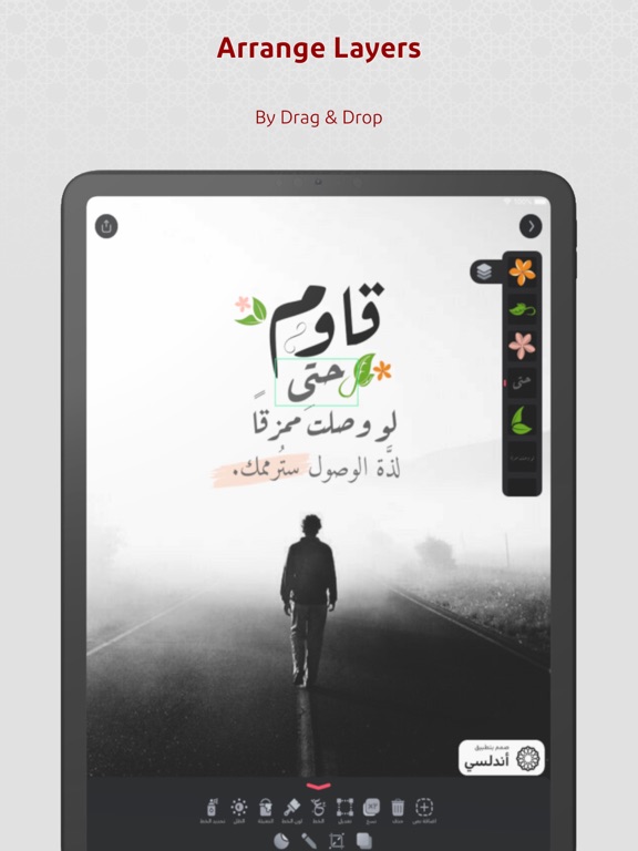 لوحة الطبقات حيث يمكنك التحكم في تسلسل النصوص والملصقات والصور كما في الفوتوشوب تماماً