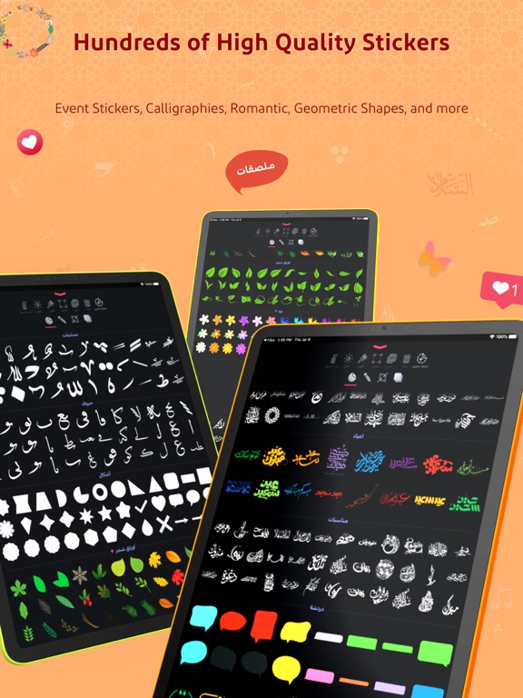 مجموعة كبيرة من الملصقات التي تحتوي على العديد من الأقسام مثل التشكيلات والمخطوطات والتأثيرات وغيرها. حيث يمكنكم التعديل على الوان الملصقات وظلها