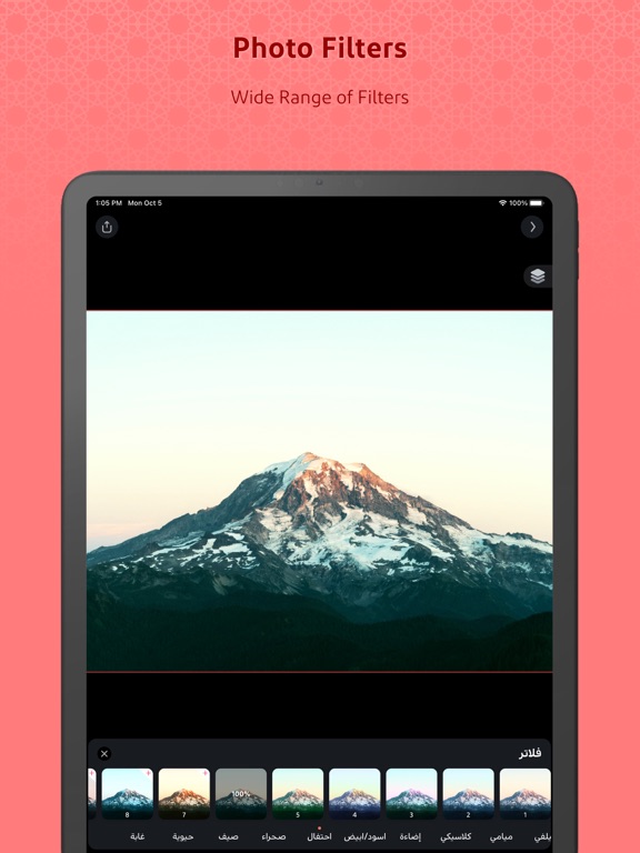 • مجموعة ضخمة من فلاتر الصور المختارة بعناية مع امكانية التحكم بشدتها.