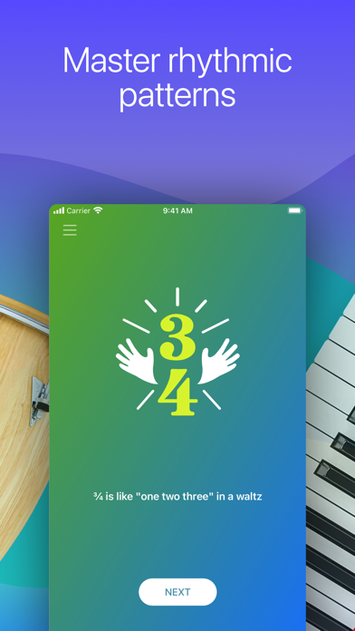 Practice 15 minutes a day in an individual session. Listen to the rhythm and then tap the rhythm right away anywhere on the screen with your finger. The app will adjust the tempo and rhythms for you.