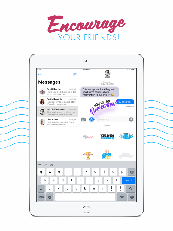 Use the K-LOVE Stickers: Once you’ve decided what sticker you’ll use to encourage your friend with, you’ll Tap it once to send as a message. If you tap and hold down a sticker, you have the option of dragging and dropping the sticker on a text, bubble, another sticker, photos or videos as well as expanding or shrinking the sticker.