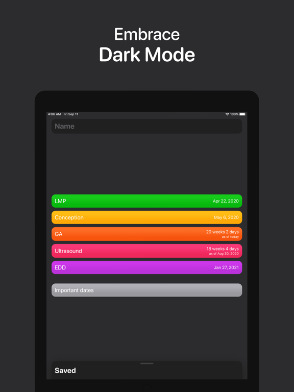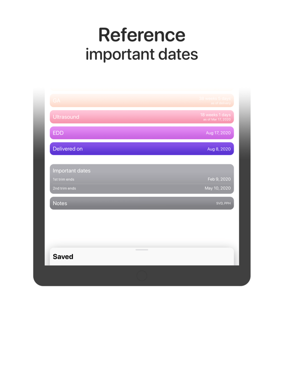• Pregnancy dates from LMP, ultrasound, conception, or EDD.