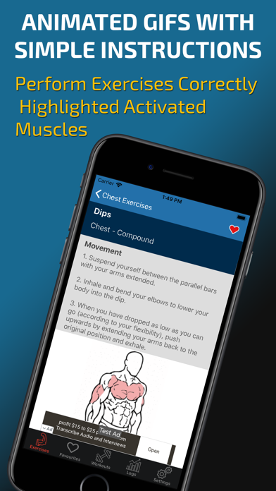 Browse or search over 160 exercises separated into targeted muscle groups highlighting the activated muscles on animated figures without having to click to an external site or wait for slow videos to load.