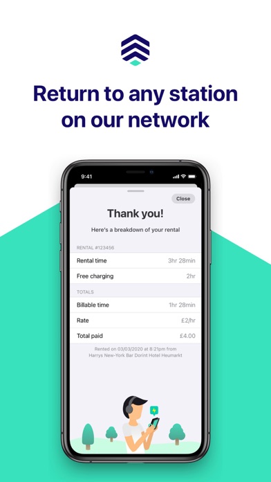 Set up your form of payment in the app, including cards and Apple Pay. Scan a station’s QR code, select your pricing plan and rent a power bank -- it’ll pop out of a station like a piece of toast!