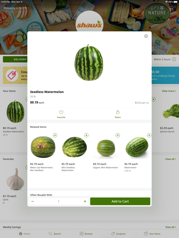 Create an Instacart account or use an existing Instacart account and begin shopping with Shaw’s. Shop for your groceries online with the Shaw’s Rush Delivery App and get fresh produce, meat, dairy, eggs, beverages, baby products, a wide selection of organic items, and much more. Shaw’s Rush Delivery app includes the following features which make shopping easy and convenient: