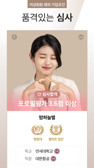남성회원의 경우 등기부등본, 원천징수 영수증, 의사 면허증 등 의 서류를 제출 시 인증 뱃지를 통해 이를 증명할 수 있습니다. 여성 회원의 경우 기존 회원들의 프로필 심사 과정을 통과해 일정 점수 이상 획득해야만 가입이 가능합니다.