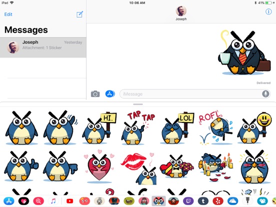 Hi, I'm Grumply. In this sticker app, I'm a penguin. There are over 60 stickers for you to enjoy. They become yours when you purchase this app. And you can use them. You can use them all. You can use them to make your friends laugh. You can use them to make yourself laugh. You can even use them to make your mom laugh. Why? Because I'm Grumply. And this is my app.