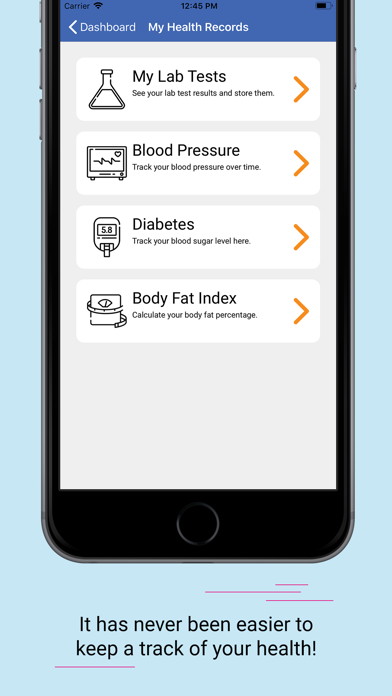 Our App helps you track your healthcare management. The user dashboard is a complete record of your prescriptions and lab diagnostics and helps monitor your blood glucose, blood pressure and body fat index readings.