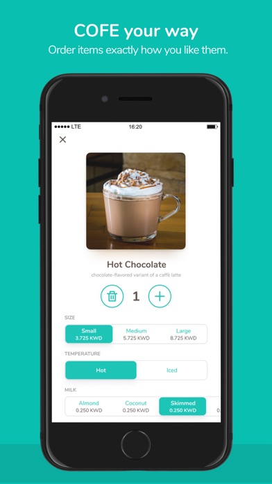 Skip the line with our COFE concierge service. Place our order using the app and get the COFE Vendor closest to you to get you the caffeine loaded beverage of choice. The Get COFE service is currently available for your COFE Vendor shop counter, car(s), office(s), classroom(s), hospital(s), Kuwait International Airport Departure Gate(s).