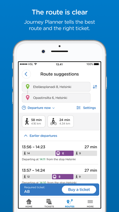 In addition to tickets, there is also a journey planner in the HSL app. Journey planner tells you e.g. the best route and the ticket, which is needed for the route. In the HSL app, you can also see up-to-date transport information for the areas and lines you have selected.