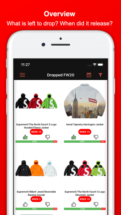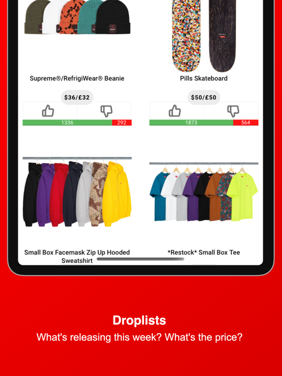 Find out what might be dropping on Thursday, get notified about Restocks of already sold-out items, view which item sold-out the fastest, upvote your favorite Season items, dig in the item history of Supreme, attend awesome Giveaways & get to meet new people and communicate with the Supreme community and culture. And that isn't all - Check this Fan-Made-App out. From Fans for Fans!