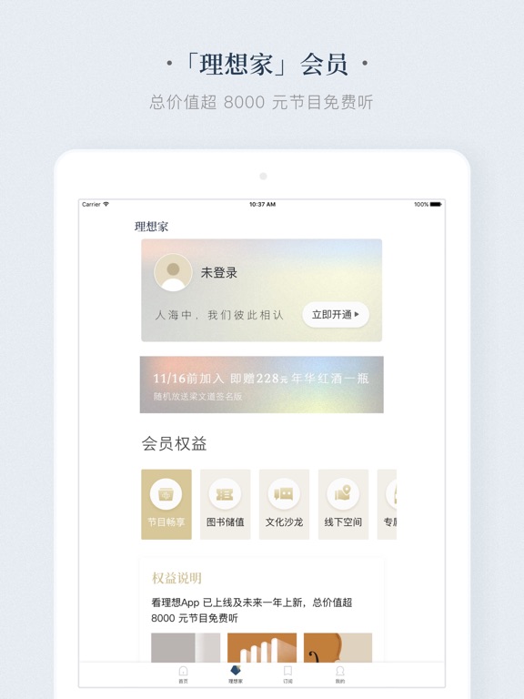 全新上线的“理想家”,突破了常规的会员模式,将用户与创作者密切地联系在一起,同时将音视频节目与图书阅读、空间体验做更加多重又创新的结合。