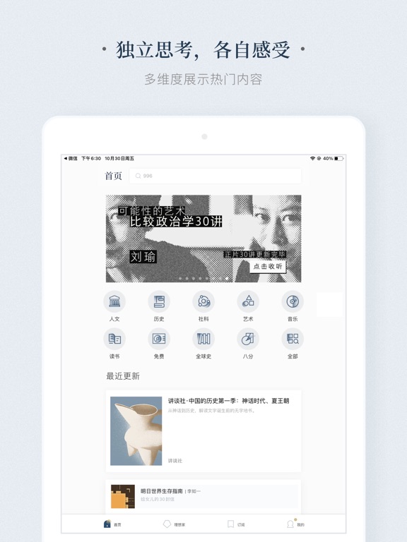看理想,专注原创音视频内容的出品,以文化品牌理想国的图书为起点,我们从文字、影像延伸到了移动应用。
