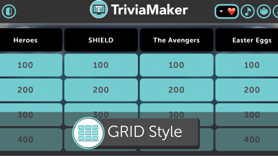 Unlimited Games, up to 4 teams per game, up to 16 questions on Feud, 6 categories in GRID, and 4 answers per question on Trivia. Premium accounts also have the added ability to add custom colors, songs, backgrounds, and logos to their trivia games.