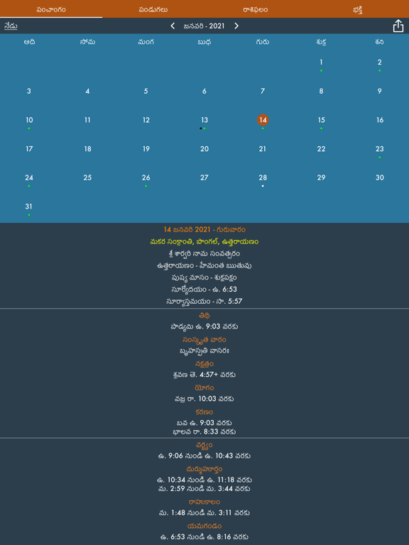 3) Swipe between Panchangam, Festivals, Rashi phalam and Bhakthi tabs to view detailed panchangam results or festivals list or Telugu Horoscope details or spiritual articles.