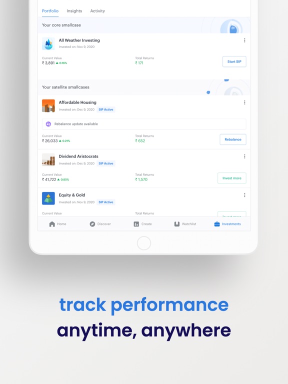 See how your smallcases are performing with index values set for each smallcase. Invest more, start a Systematic investment plan (SIP), rebalance, exit, add or remove stocks in 2 clicks while on the move.