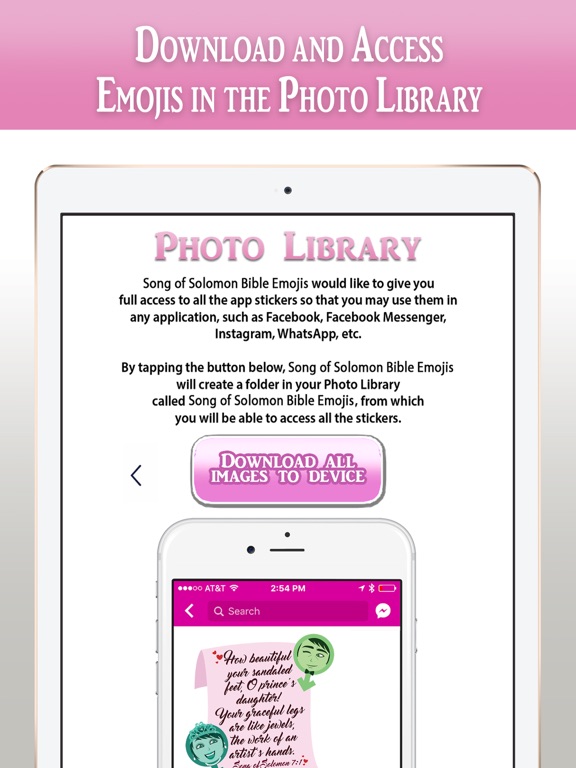 Option 2: By tapping the “Download Images to Device” button on the last page in the app. The Emojis will upload to a folder in your Photo Library called Song of Solomon. You may use them in various applications, such as Facebook, Facebook Messenger, Instagram, WhatsApp, etc.