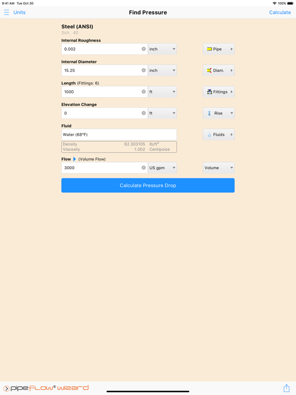 Pipe Flow Wizard is the #1 fluid flow rate and pressure loss calculator app from Pipe Flow Software. Perform flow rate calculations, calculate pressure drop in a pipe, size a pipe diameter, or calculate a maximum pipe length for a given flow rate at an allowed pressure loss.