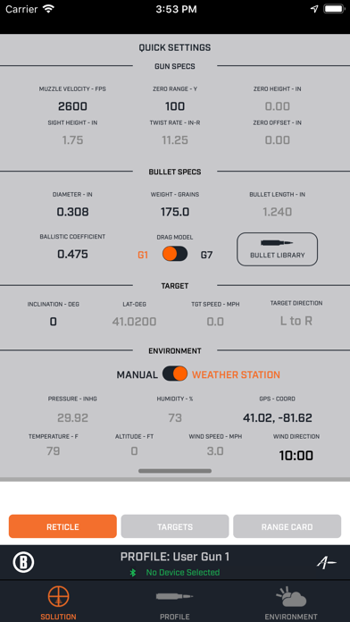 Welcome to the new Bushnell® Ballistics Application powered by Applied Ballistics®. It is a full-featured ballistics solver to use with your Bushnell rangefinders and riflescopes to calculate firing solutions. It allows you to use current atmospherics to calculate the holds and display the ranges at each subtension on your reticle. With this application, you can build and modify gun profiles, create a custom target, show a range card and calculate firing solutions based on your exact scope and ammunition. Additionally, range cards may be emailed to yourself or a friend.