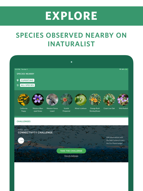 Use the power of image recognition technology to identify the plants and animals all around you. Earn badges for seeing different types of plants, birds, fungi and more!