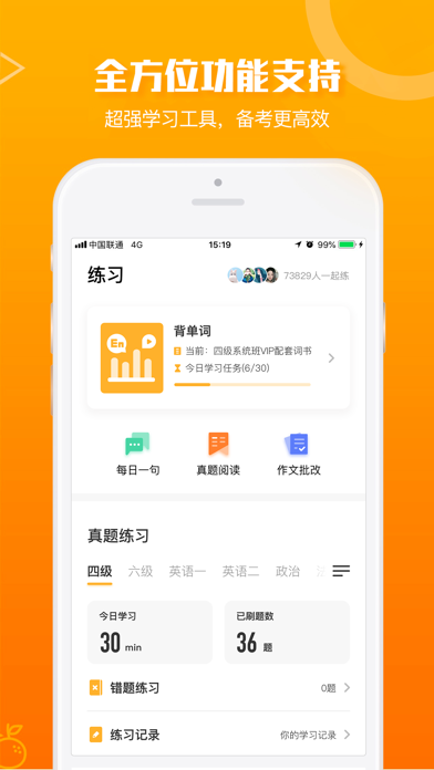 橙啦是一款服务年轻人的高品质学习APP,专注于打造大学英语四六级、考研、实用英语等优质在线直播课,并提供配套精品学习资料。所有课程均由行业名师坐镇,历经数年教学经验打磨,涵盖所有必考、必学知识点,已累计帮助数百万学子在考试、在实用英语使用上,获得重大突破。 直播+录播的授课形式,深入浅出的课程讲解,课堂氛围轻松愉快,在这里,我们与万千学子共享成长的喜悦。另有专为学习开发的背单词小程序、院校库、真题库、在线批改等免费工具,从学习规划到知识吃透,橙啦一路为你的进步助跑。
