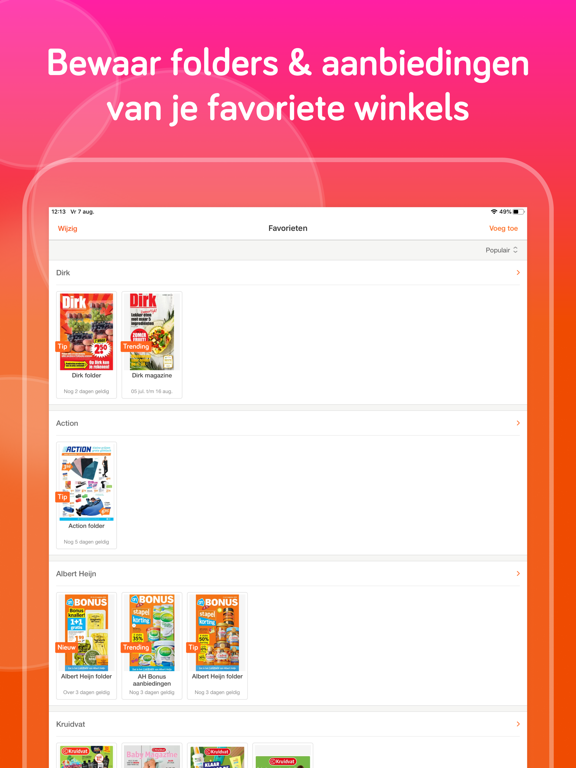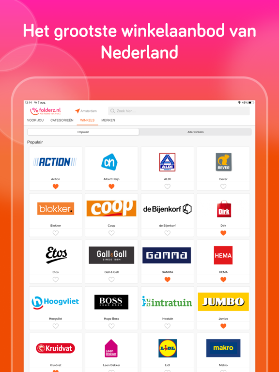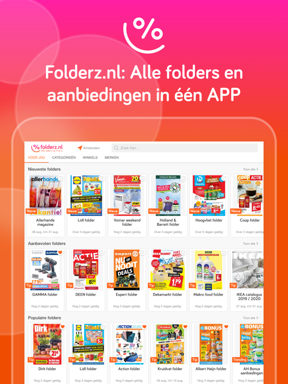 Onze Reclamefolders APP by Folderz.nl toont je alle actuele folders van grote en kleine winkelketens in Nederland, niet alleen alle supermarkten en bouwmarkten, maar ook elektronicazaken, modezaken, speelgoedwinkels, computerwinkels, drogisterijen en nog veel meer. Zelfs de meeste lokale winkels hebben we voor jou vermeld. Wil je een winkel als favoriet selecteren, dan kan dit eenvoudig door op het hartje te klikken. Hiermee ben je altijd als eerste op de hoogte van aanbiedingen van jouw favoriete winkels en heb je jouw favoriete reclamefolders handig bij elkaar verzameld.