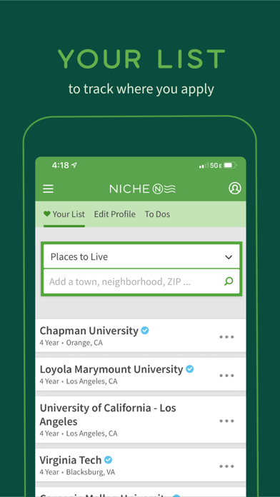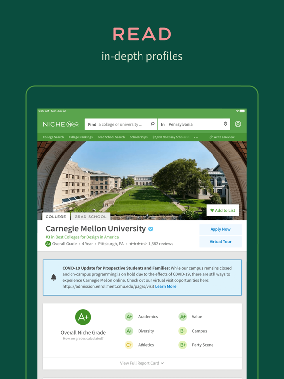 In-Depth College Profiles: Explore nearly 7,000 college profiles that include cost, admissions requirements, student life, and college reviews from current students and alumni.