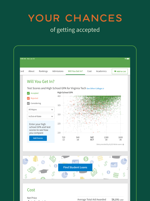 Admissions Calculator: View your chances of getting into colleges based on your GPA, SAT/ACT scores, and major.