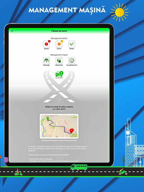 - configurarea foarte ușoară a tuturor tipurilor de alerte aferente mașinilor, conducătorilor auto sau orice alte notițe (memo).