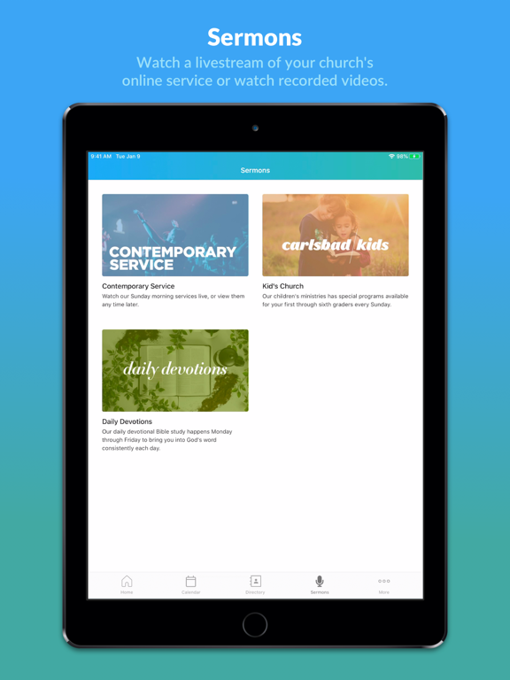 See a calendar of events, access sermons, give, pre-check your family, browse the directory, join groups, and register for events on iOS.