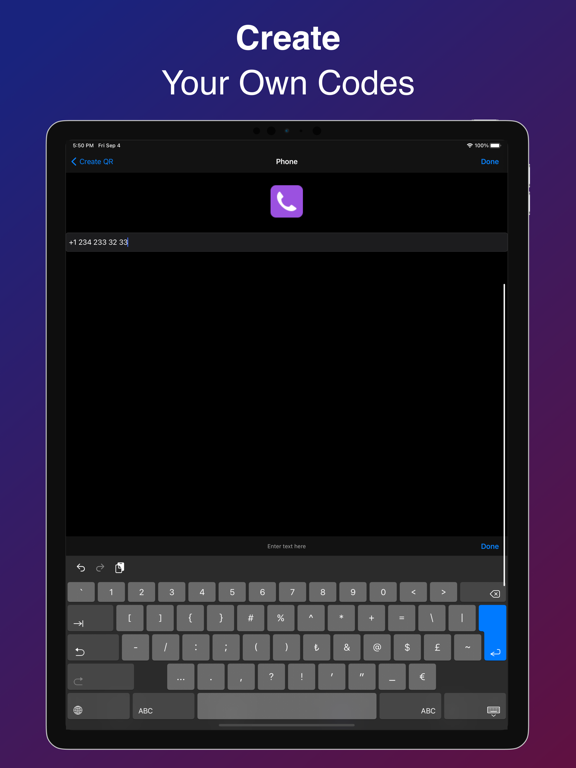 You can also generate QR codes for any text, URL/Links, Telephone, Address, etc. with the app. Just type the text and you will see the QR code.