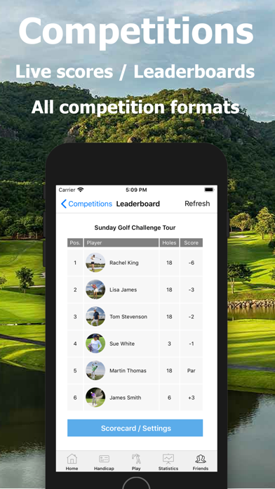 - Create golf competitions based on net score, gross score, stableford points, match play or skins