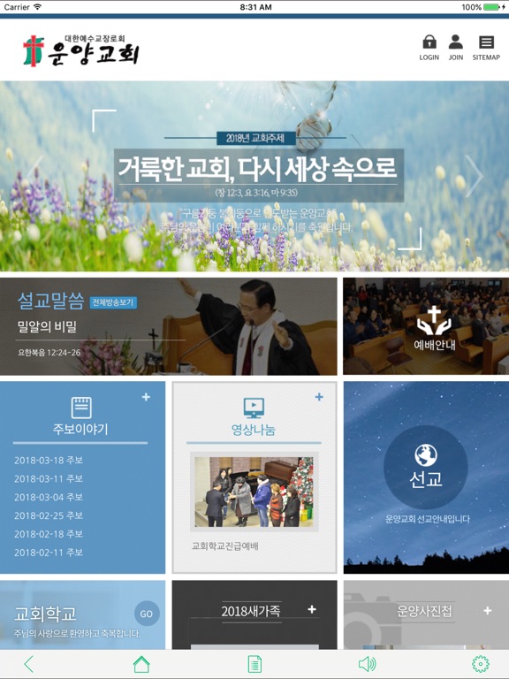 * 100% 연동형 앱 : 홈페이지에 등록된 내용, 게시물, 설교영상, 사진 등의 콘텐츠를 앱과 100% 연동하여 실시간으로 앱을 통해 확인할 수 있습니다.