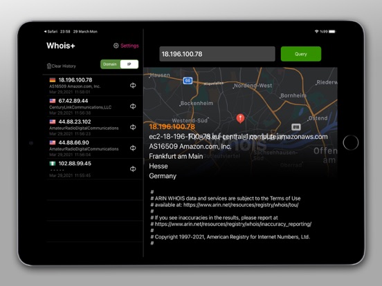 - Supports ARIN, RIPE, APNIC, LACNIC, AFRINIC and referral servers