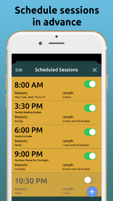 SCHEDULE SESSIONS – Schedule sessions in advance by setting a time during the day, choosing whether you want them to repeat on certain days of the week, and setting a duration. Want to be off your phone at 8am Monday thru Friday for 4 hours? Done. Easy peasy.