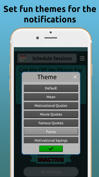 NOTIFICATIONS – The notifications are what keeps you focused and off your phone. You can customize the frequency and theme of them. You can set the frequency anywhere from 2 to 10 seconds. You can also change the text of the notifications to various fun themes such as movie quotes, inspirational quotes, or you can make them mean to give you that extra bit of inspiration to get back to work.