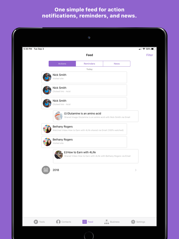 Feed: Keep track of everything you’ve shared and see what your contacts have viewed with notifications. You can even swipe notifications to mark them as a Reminder. News also brings all of the latest announcements and social posts from corporate straight to you in one convenient place!