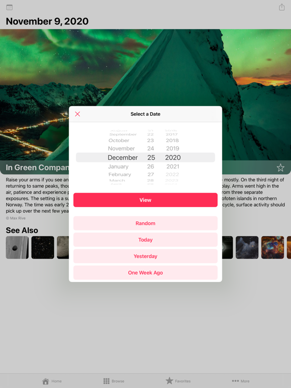 A new photo is published by NASA every day (around midnight ET), and you can view it in the app right away. You can also select a day in the past, dating back as far as 1995. If you like a photo, add it to Favorites, save to your photo library, or share with friends.