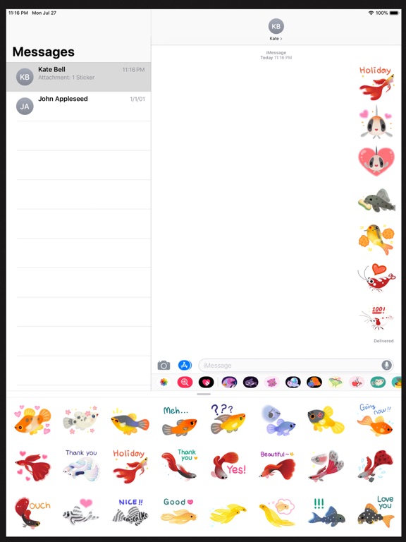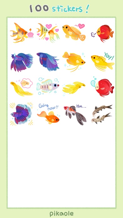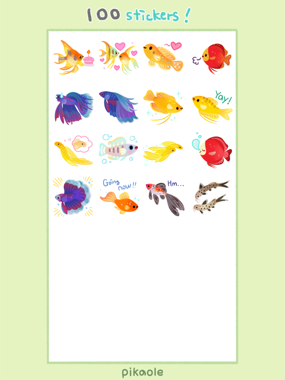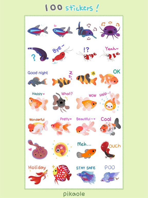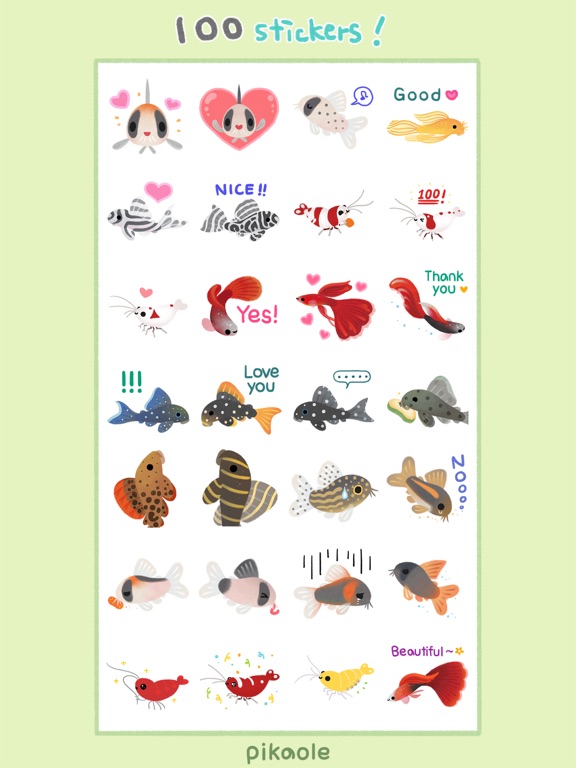 100 fish sticker pack. (corydoras, guppy, pleco, discus, ocella, multies, ramirezi, betta, cardinal tetra, clown loach, bee shrimp, ranchu, ryukin, catfish...etc) Have fun with happy freshwater tropical fish and shrimp, goldfish stickers! instagram / twitter : @pikaole