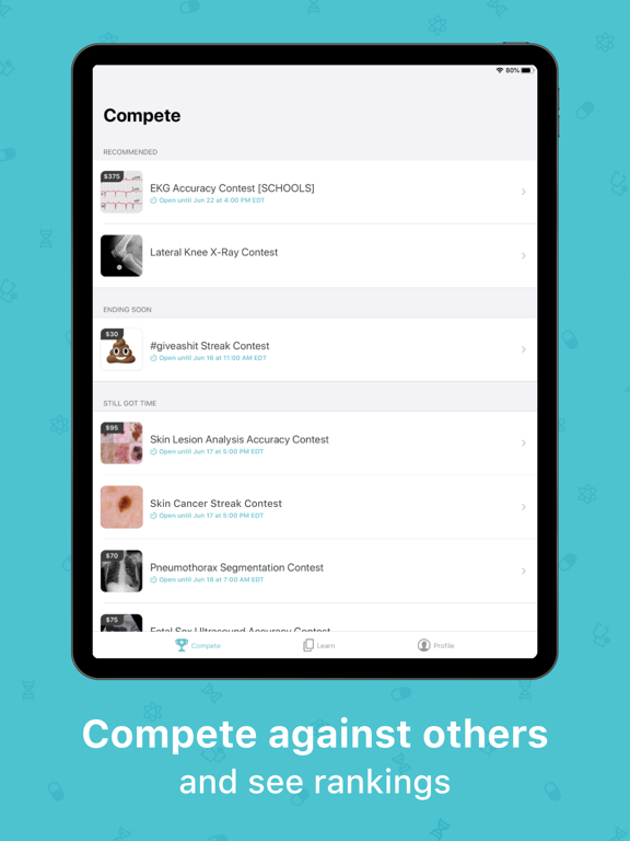 Participation is open to anyone, regardless of educational background. Users compete against their peers to hone their skills by analyzing cases in our datasets. At the same time, they contribute their knowledge to help advance artificial intelligence research.