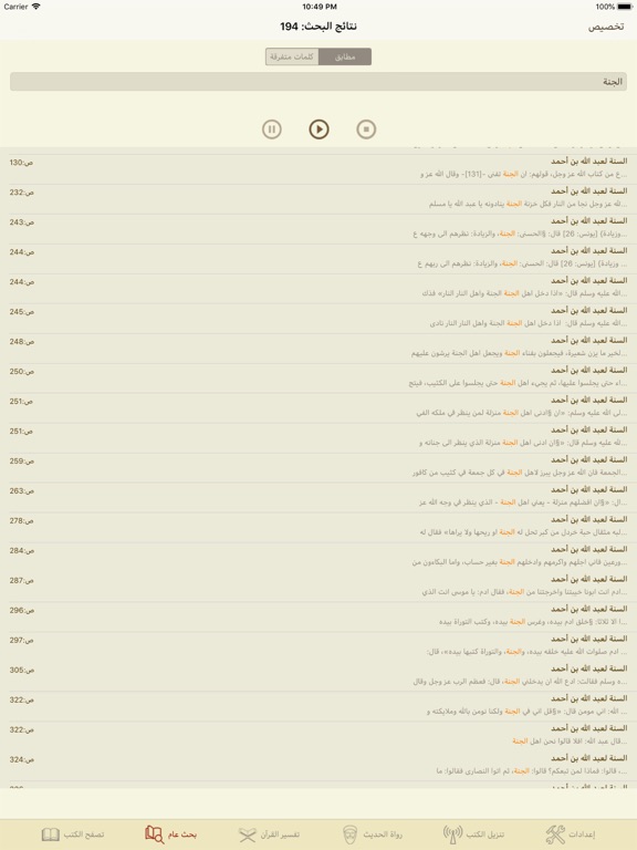 ٤- لأول مرة على الأجهزة الكفية يمكنك البحث في الجرح والتعديل لرواة الأحاديث بسرعة فائقة وسهولة منقطعة النظير حيث يمكن البحث بأي جزء من اسم الراوي، فلو كتبت مثلا عمر الخطاب العدوي ستجد في النتائج الاسم الكامل لعمر ابن الخطاب