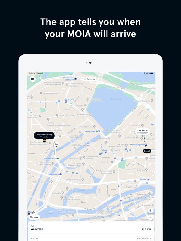 MOIA brings you comfortably to your destination in Hamburg or Hanover: to the central station, train or most important places to see in the city. Leave your car elsewhere, book your ride with our convenient app, and pay by credit card, PayPal, or Apple Pay. If you travel by bicycle or scooter already, you’ll find the perfect zero-emission alternative with the fully electric MOIA shuttle. More convenient than public transport, no hunting for a car park, and no unnecessary detours, enjoy comfortable and private seats, Wi-Fi, and USB ports for charging your devices. Unlike a cab, you share your ride with up to four other passengers – which lets you travel at an exceptionally low price. The app of course tells you in advance how much it costs, where you’ll be picked up, and when you’re expected to arrive. You’ll save yourself stress and reduce traffic for everyone else.