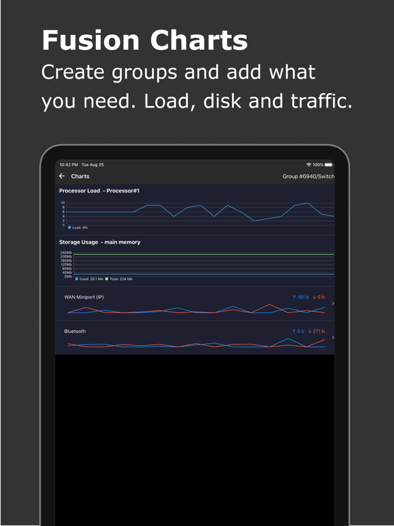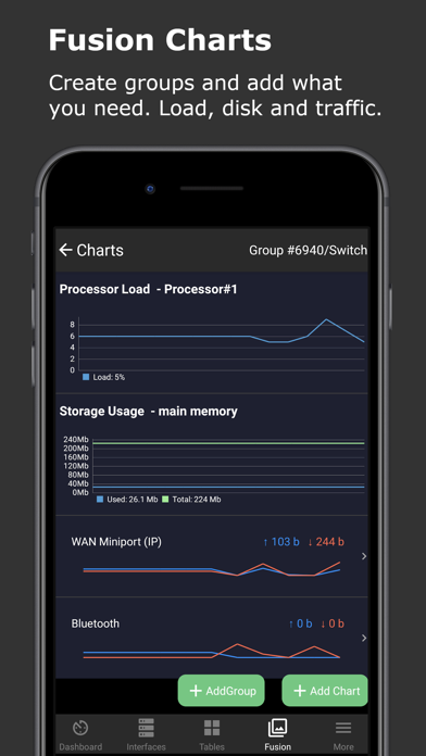 • Fusion Charts. Create chart groups and add what you need. For example, create a group with cpu load, memory usage, ether1 traffic rate and wlan traffic rate.