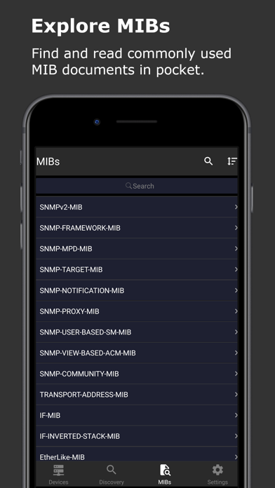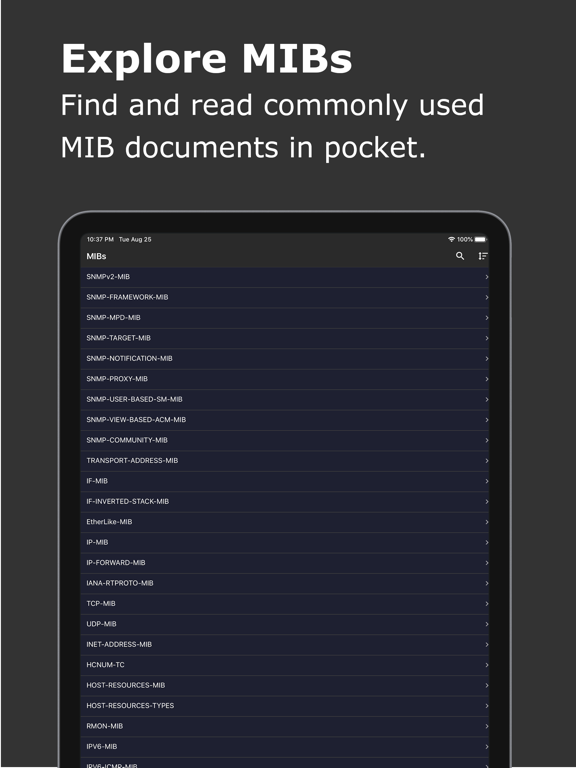 • MIB explorer. The app includes commonly used MIBs. Search MIB or OID information, view detials in good format.