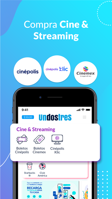 UnDosTres es la súper app de México, donde puedes recargar, comprar y pagar +100 servicios y operadores. Puedes recargar tiempo aire y tag, pagar servicios como CFE, agua, gas, TV, teléfono e internet, comprar celulares y electrónicos oficiales de las tiendas de Xiaomi y Doto, comprar boletos de autobús, comprar saldo para Uber y Uber Eats, recargar saldo para Mobike y Jetty, comprar crédito para tus plataformas de streaming favoritas, boletos de cine y mucho más.