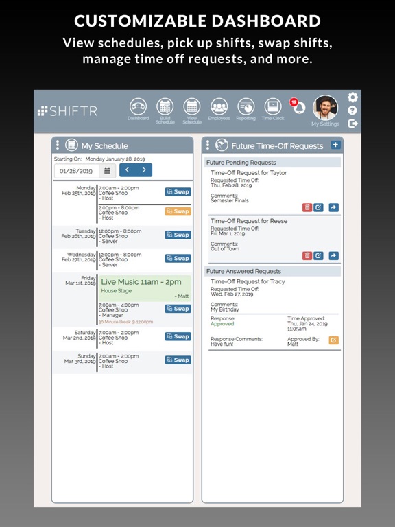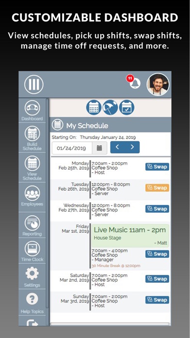 • Streamline communication with automatic notification options for new schedules, time off requests, shift swapping, shift reminders, and more